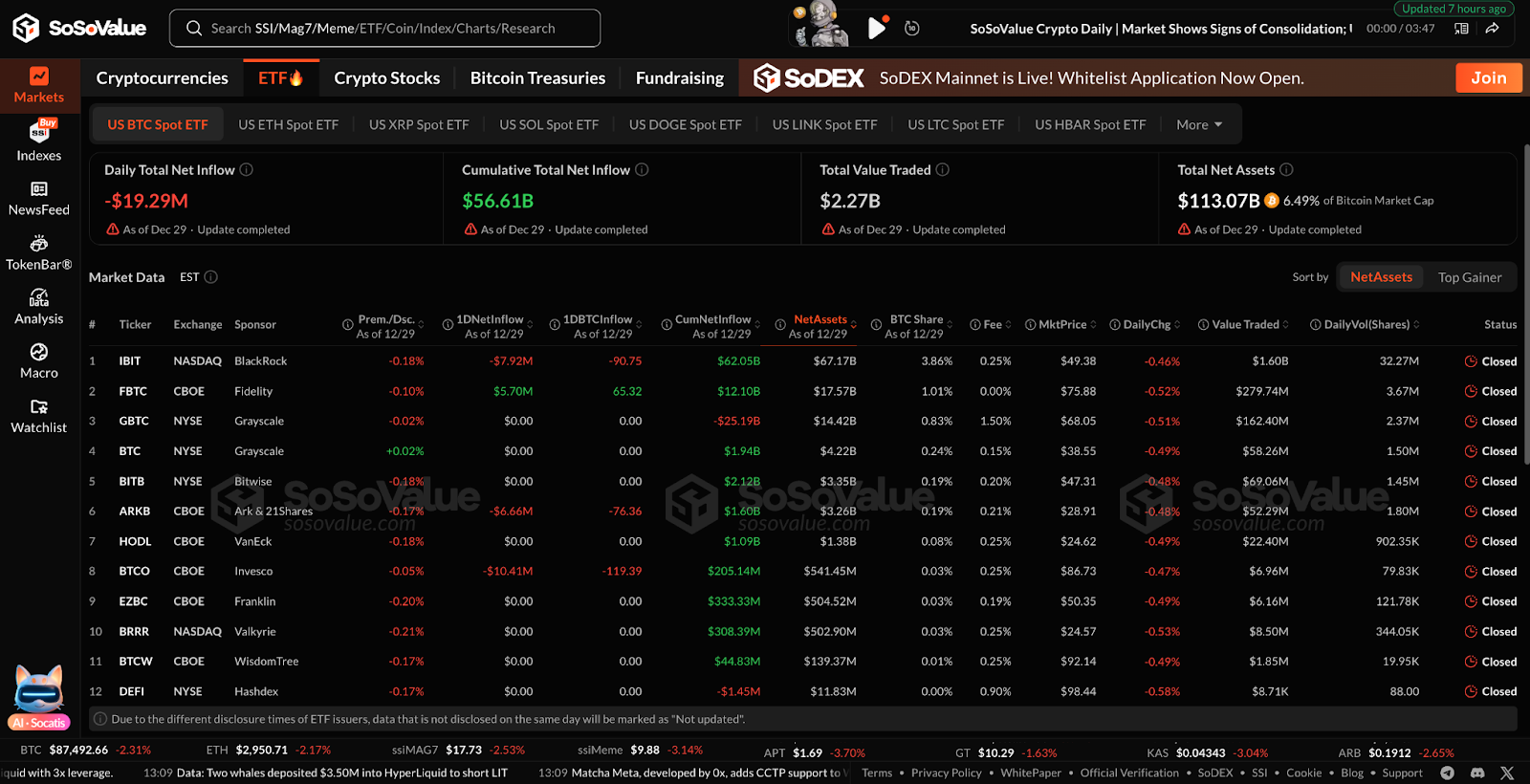 U.S. spot Bitcoin ETFs posted a $19.3 million net outflow on December 29, extending a run of cautious institutional positioning. Total value traded stood at $2.27 billion, reflecting steady activity but limited convic…