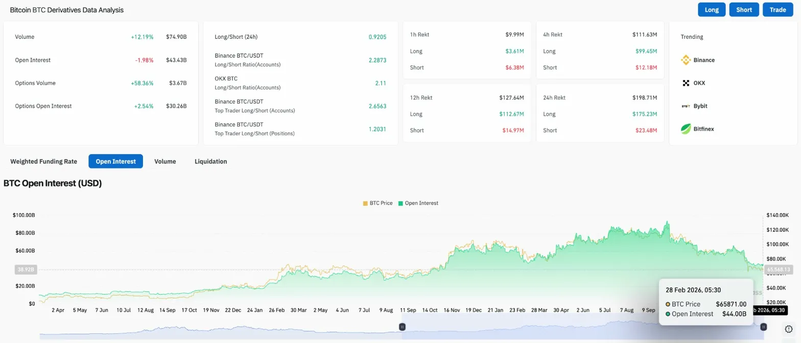 Open interest declined 1.98% to $43.43 billion, continuing a multi-week deleveraging process. Volume surged 12.19% to $74.90 billion, a combination that confirms forced liquidations rather than organic profit-taking. When OI drops sharply while volume spikes, it signals that overleveraged positions are …