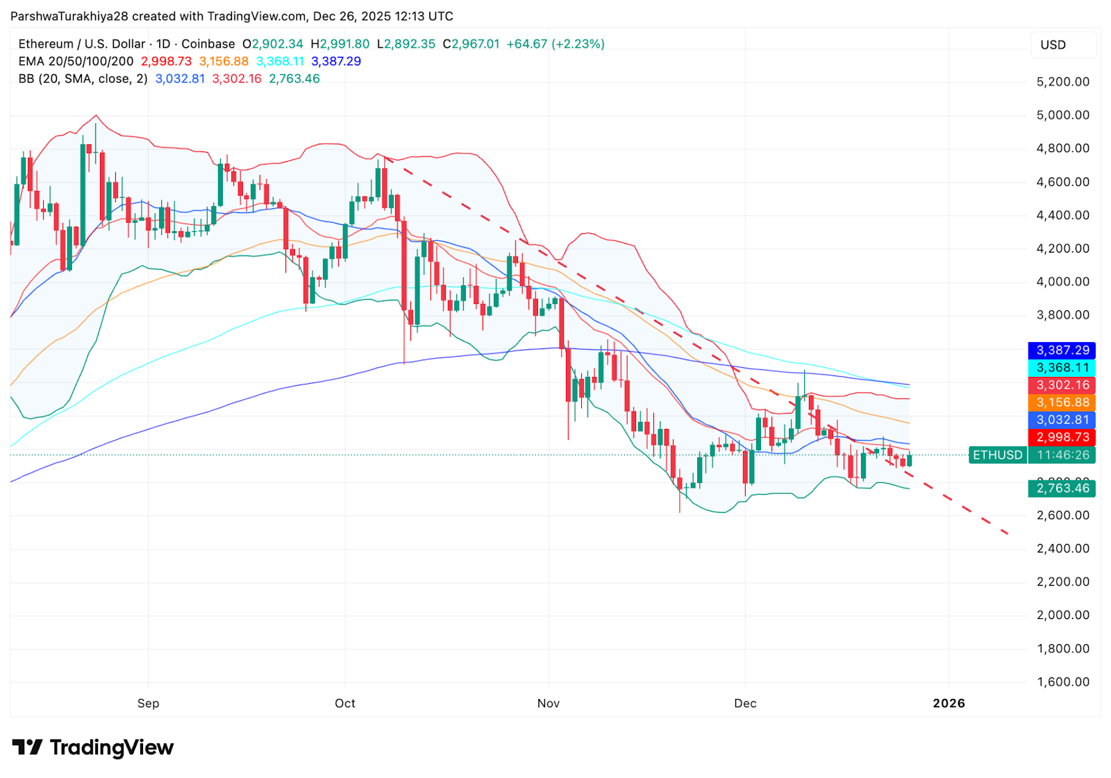 Ethereum price today trades near $2,970 after bouncing modestly from recent lows, but the broader structure remains under pressure. Price continues to sit below its declining trendline and heavy EMA resistance, keeping buyers on the defensive. The tension heading into December 27 centers on whether ETH can stabilize above key support or if the market resumes its corrective path.
