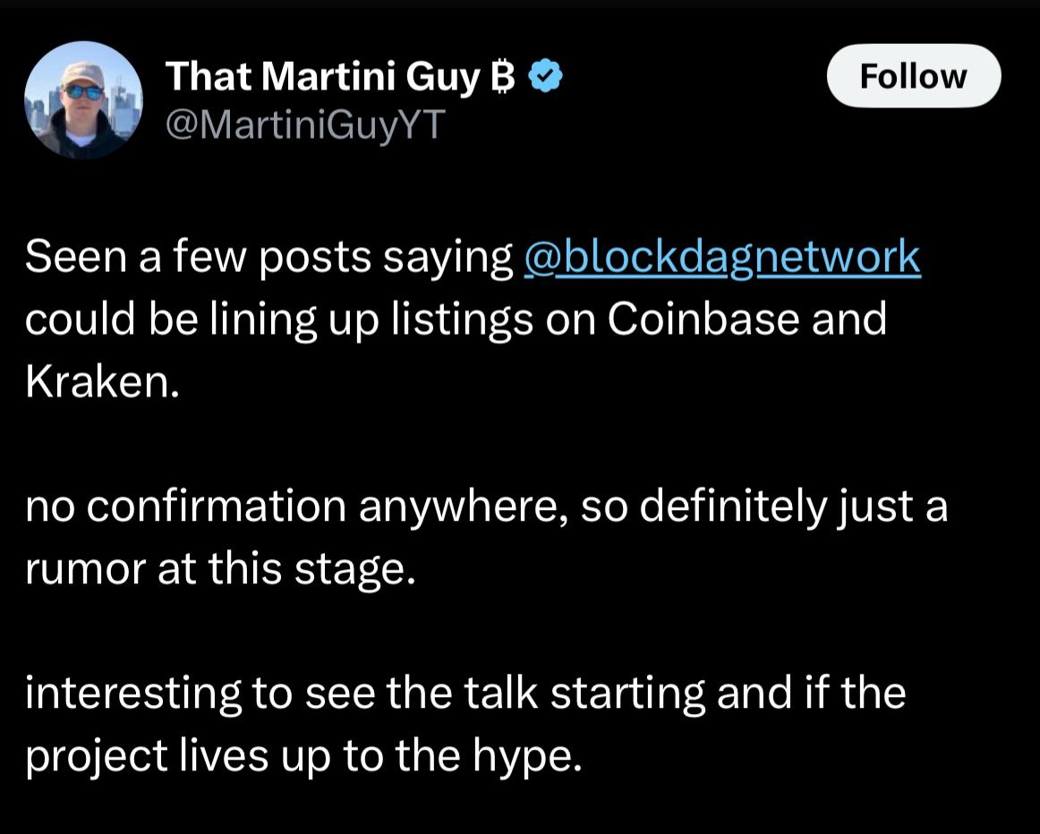 What started as a whisper has now ignited a full-blown crypto firestorm. A tweet from influencer @MartiniGuyYT, who has over 100K followers on X (formerly Twitter), leaked what appears to be an internal exchange integration sheet showing BlockDAG (BDAG) scheduled for listing on both Kraken and Coinbase. The now-viral post viewable here sent shockwaves through the community, triggering fresh speculation that BlockDAG may be the next major coin to explode.