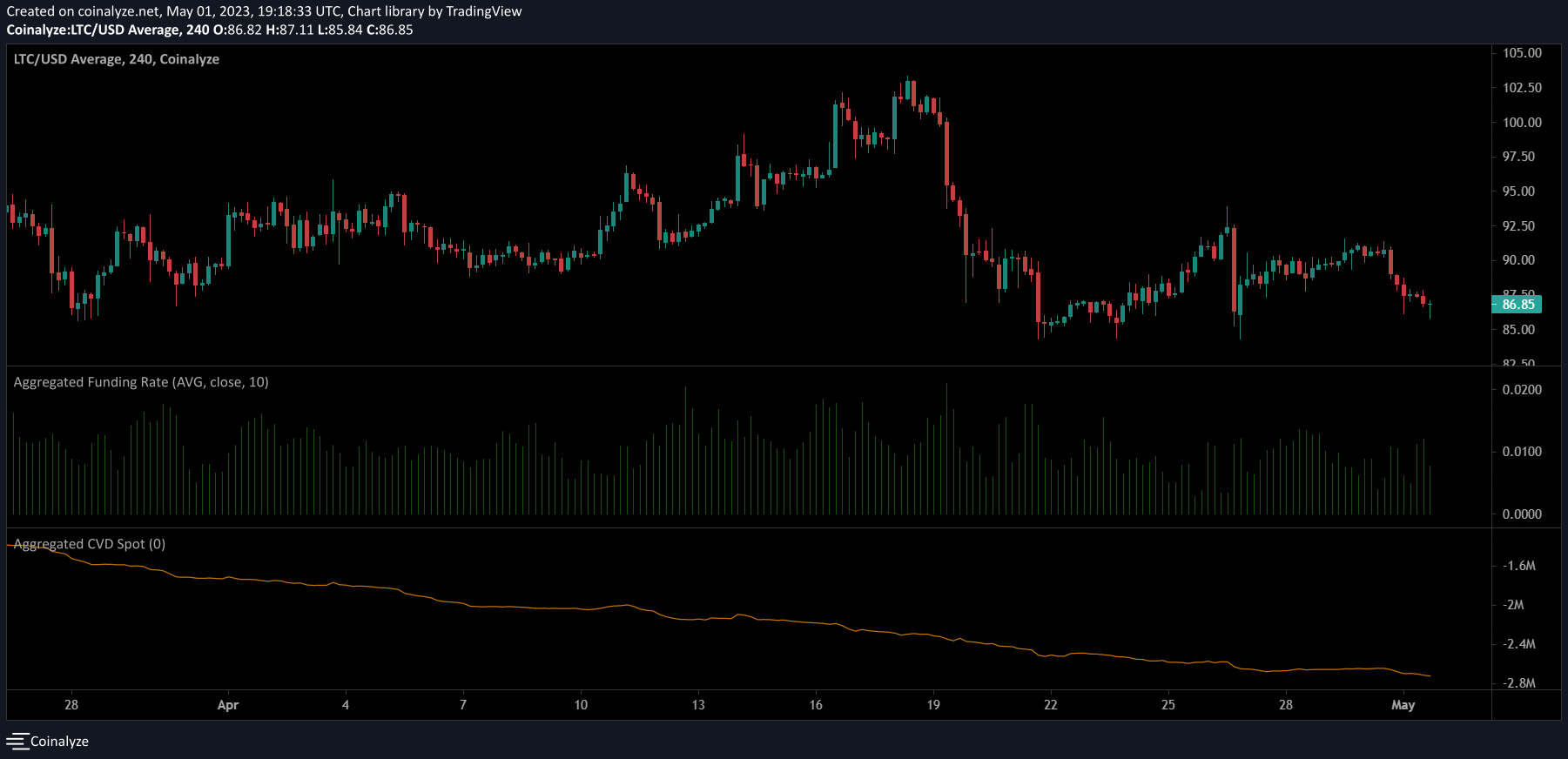Data from Coinalyze showed that the funding rate for LTC has been positive throughout April. However, the spot CVD posted a steady decline over the same period.