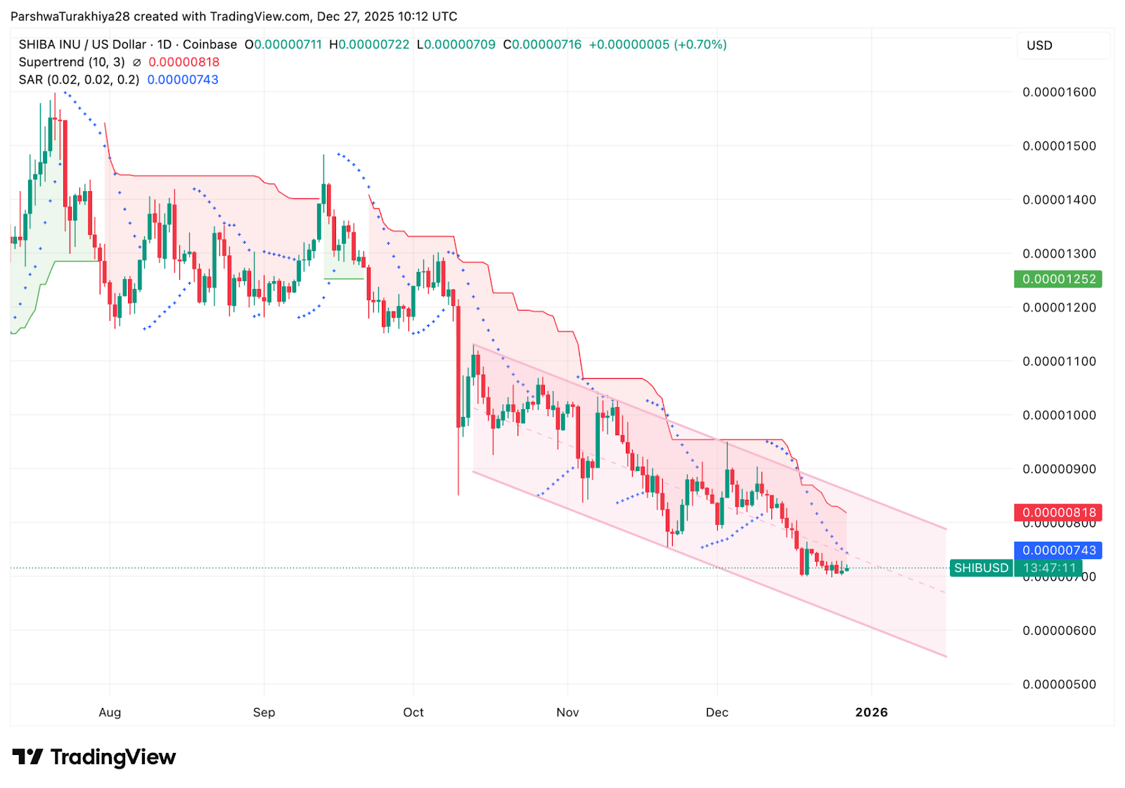 Shiba Inu price today trades near $0.00000716 as sellers continue to dictate structure heading into December 28. Price remains trapped inside a descending channel, with repeated failures near trend resistance keeping upside attempts contained.