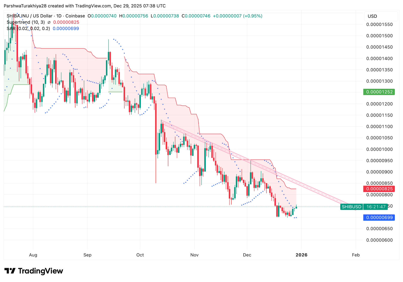 On the daily chart, SHIB remains firmly below its Supertrend resistance near $0.00000825. The broader t…