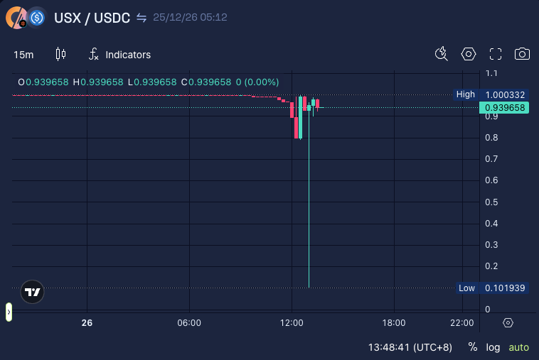 Solana (SOL) based synthetic stablecoin Solstice USX (USX) temporarily depegged on Christmas Day 2025. The small-cap stablecoin with a fully diluted valuation of about $283 million dropped to as low as $0.1, a temporary crash that ended almost immediately after the Solstice team stepped in to intervene.