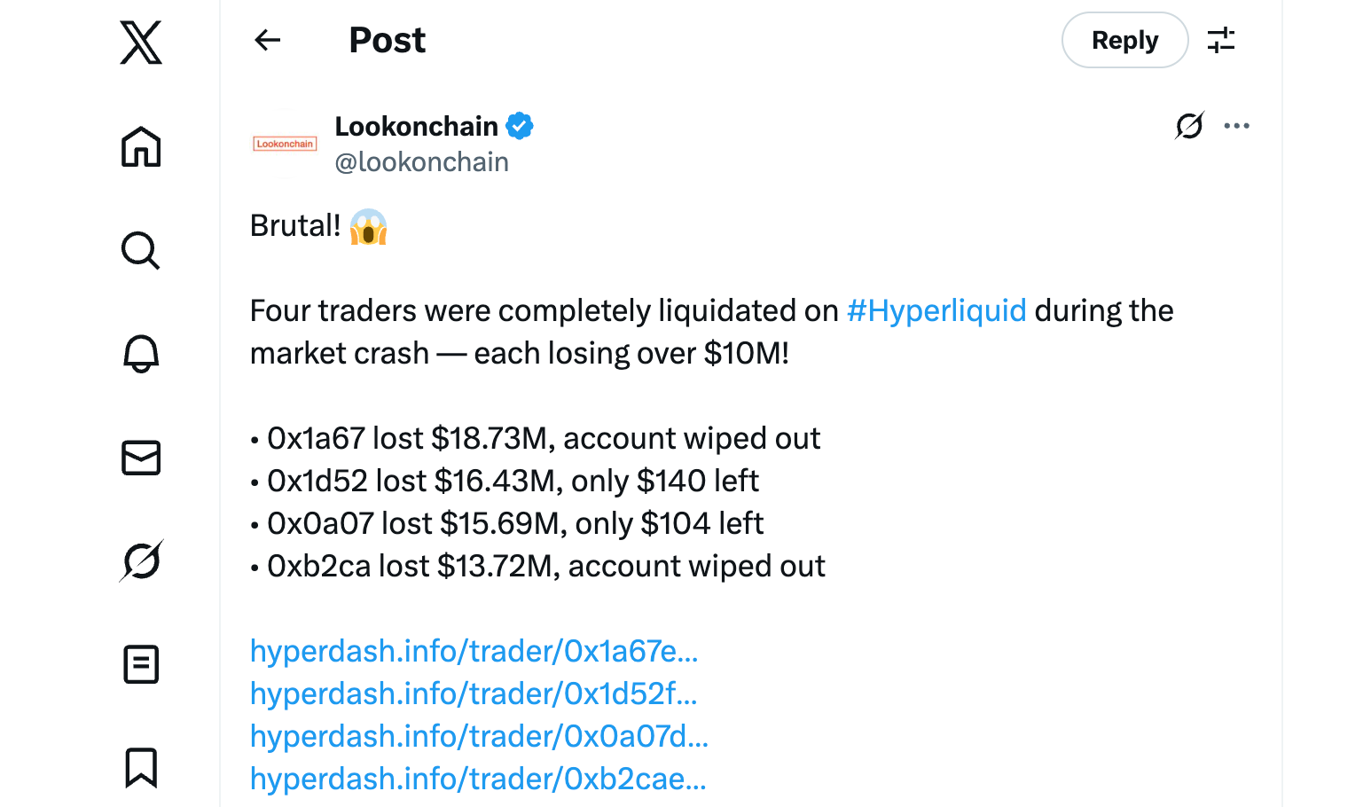 On the decentralized exchange Hyperliquid, four large traders were completely wiped out. According to Lookonchain, one lost $18.73 million, another $16.43 million, the third $15.69 million, and a fourth $13.72 million — some were left with just over $100.