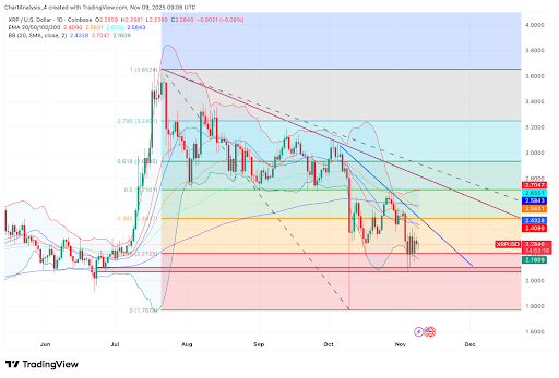 XRP price today trades near $2.28, struggling to recover after multiple failed attempts to reclaim overhead resistance. The market continues to reject XRP at key moving averages and descending trendline levels. The latest data from derivatives and spot flow platforms confirms that both leverage and capital are leaving the market, signaling hesitation from buyers at current prices.