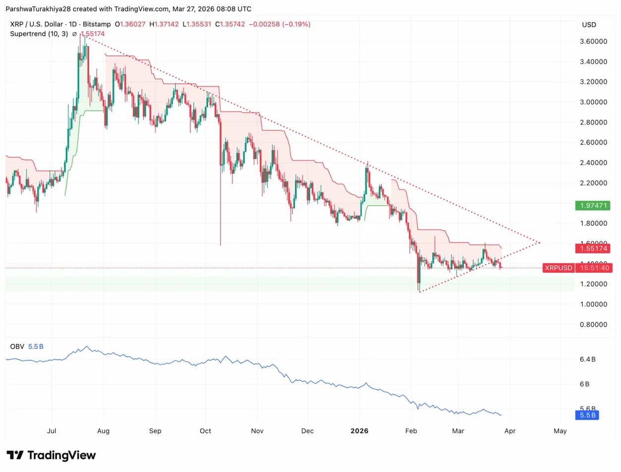 XRP trades at $1.357 on March 27, quietly compressing inside a symmetrical triangle that has been forming since the February low at $1.19. The Ripple ecosystem made headlines this week for reasons unrelated to price: XRPL published a detailed security overhaul, confirming AI-assisted red team testing has already uncovered more than ten bugs, with the next protocol release dedicated entirely to fixes rather than new features.